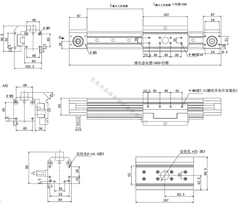 產(chǎn)品介紹 鼎格 DGE-60-TB-EG 同步帶往復(fù)直線滑臺(tái),缸筒型材64*64mm,有效行程1-6000mm,負(fù)載能力1-60kg,重復(fù)定位精度±0.1mm(行程1米以內(nèi)的精度),最高速度5000mm/s(加減速時(shí)間 0.2秒),同步輪20齒, 同步帶寬25mm,同步帶導(dǎo)程5M,同步輪轉(zhuǎn)一圈100mm,同步輪出軸Φ15mm,總長度=有效行程+569mm,重量KG=6.98+ 0.81×行程(如行程1000mm=0.81×10)+1.8+0.82,相關(guān)配件:上銀碳鋼直線導(dǎo)軌,德國馬牌同步帶,NSK防水防塵軸承,可單軸使用也可多軸組合使用,可根據(jù)客戶行程要求設(shè)計(jì)定制.