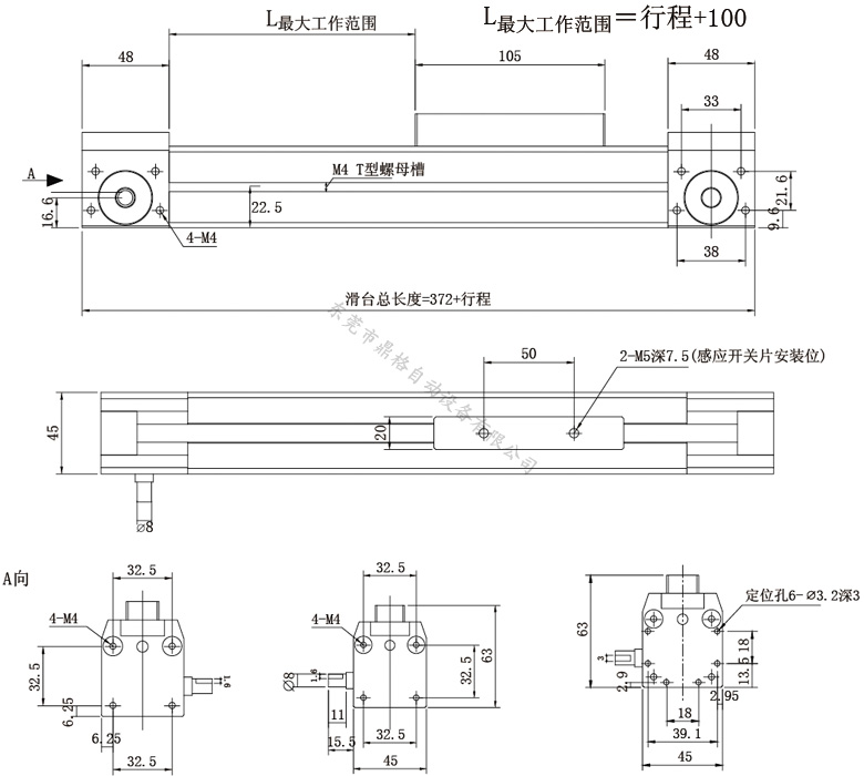 鼎格 DGE-25-TB 基本型同步帶滑臺,缸筒型材45*45mm,有效行程1-4000mm, 無負載能力,只能作為力的牽引,重復定位精度±0.1mm(行程1米以內的精度),最高速度5000mm/s(加減速時間 0.2秒),同步輪21齒, 同步帶寬15mm,同步帶導程3M,同步輪轉一圈63mm,同步輪出軸Φ8mm,總長度=有效行程+372mm,重量KG=1.85+0.29×行程(如1000=0.29×10)+0.28,相關配件:美國蓋茨同步帶,NSK防水防塵軸承,可單軸使用也可多軸組合使用,DGE25基本型同步帶滑臺適用于攝影設備等等,可根據客戶行程要求設計定制.