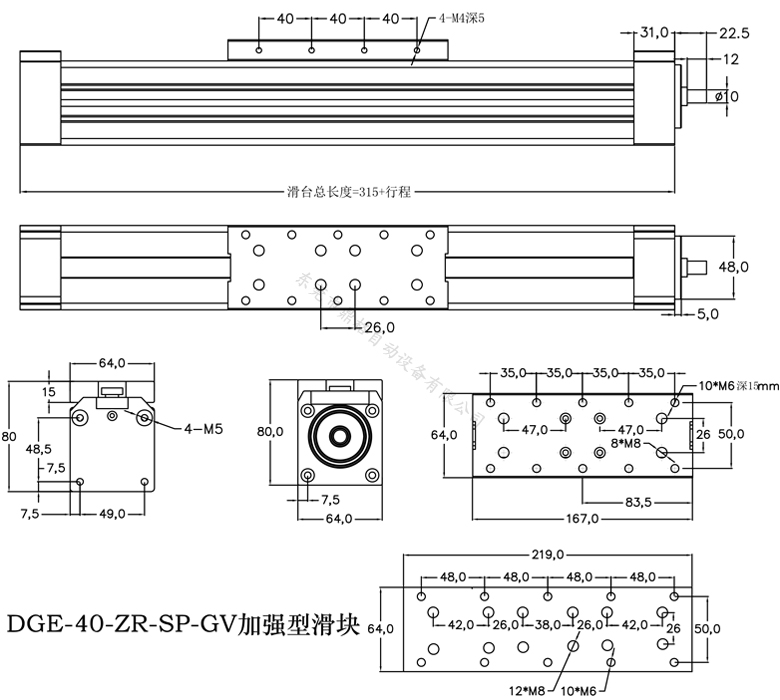 鼎格 DGE-40-ZR-SP 全封閉-滾珠絲桿滑臺,缸筒型材64*64mm,有效行程1-1000mm, 負載能力1-30kg,重復定位精度±0.02mm,最高速度1000mm/s(加減速時間 0.2秒),絲桿等級C7/C5,螺桿直徑16mm,螺桿導程5mm/10mm/20mm,絲桿出軸10mm,總長度=有效行程+315mm,重量KG=6.29+1.05×行程(如行程1000mm=1.05×10)+1.82+0.82,相關配件:上銀直線導軌,TBI滾珠絲桿,可單軸使用也可多軸組使用,可根據客戶行程要求設計定制.